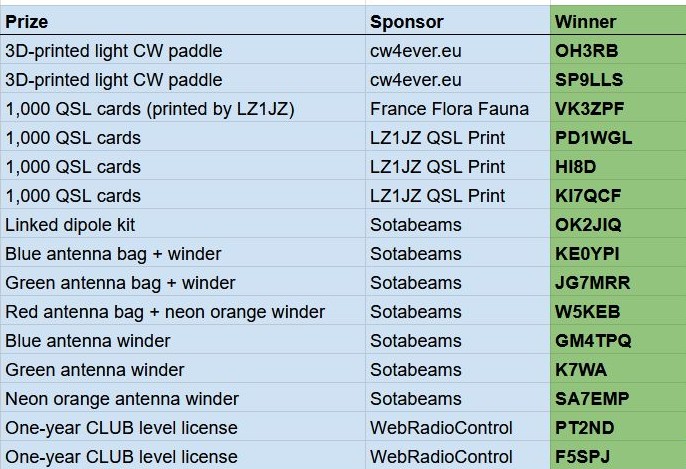 Warm thanks to all the prize sponsors and congratulations to the prize winners!! You will be contacted individually. 73 & 44 Kim OH6KZP